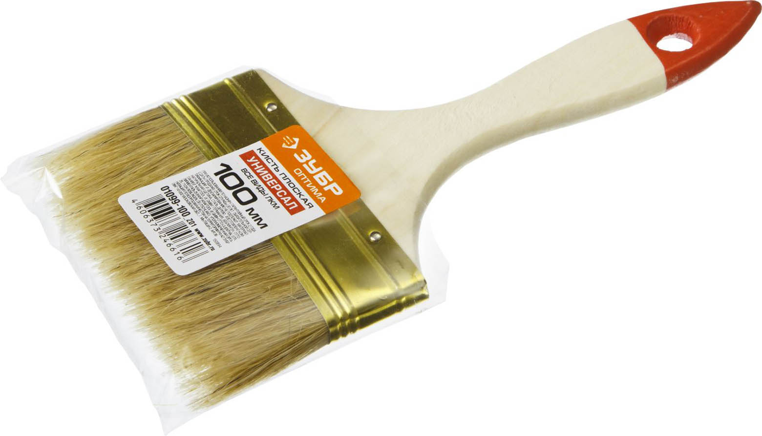 Кисть плоская ЗУБР "УНИВЕРСАЛ-ОПТИМА", светлая щетина, деревянная ручка, 100мм