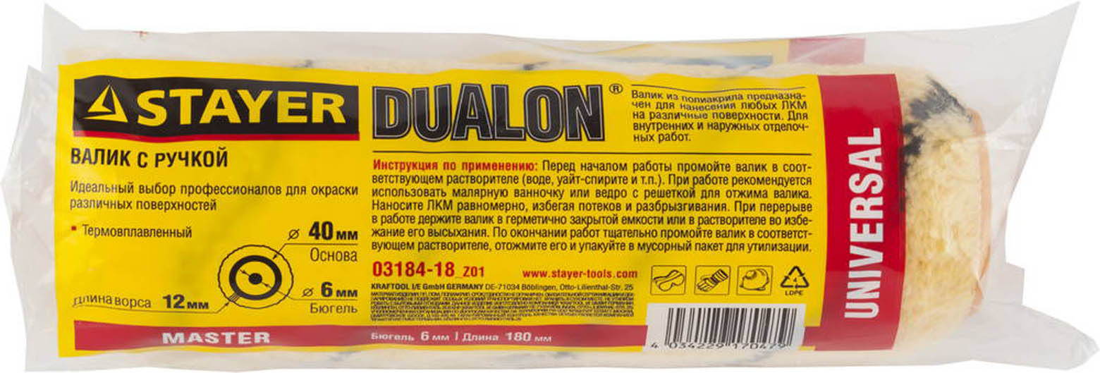 Валик DUALON ПОЛИАКРИЛ малярный в сборе, ворс 12мм, бюгель 6мм, 40x180мм, STAYER Master