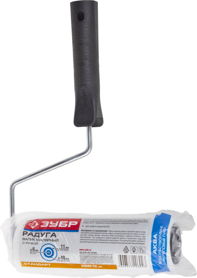 Валик малярный "ПОРОЛОН", ЗУБР 03605-10_z01, предназначен только для водно-клеевых составов. Для масляных красок, эмалей и лаков такой валик не подходит: на окрашиваемой поверхности могут оставаться кусочки материала. АКВА - для водорастворимых акриловых лаков. Обрабатываемая поверхность - гладкая. Поролон используется для нанесения водорастворимых акриловых лаков и лакокрасочных материалов на водной основе на различные поверхности. Применяется для наружних и внутренних работ.