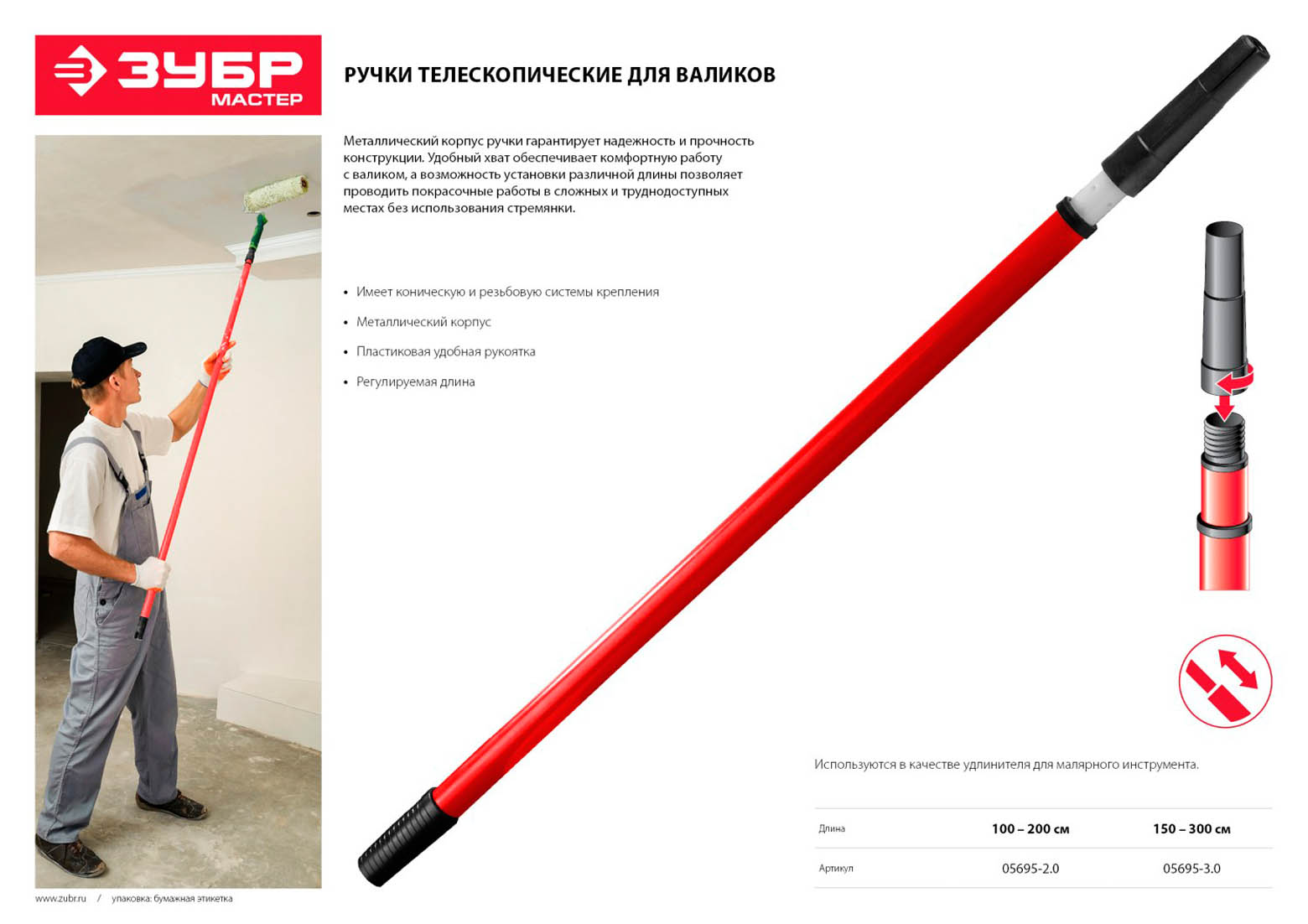 Ручка стержень-удлинитель телескопический для малярного инструмента ЗУБР 05695-2.0, предназначена для использования в качестве удлинителя для малярного инструмента. Металлический корпус удлинителя обеспечит надежность конструкции, а удобная рукоятка сделает работу с валиком еще комфортней. Возможность установки различной длины ручки позволяет проводить покрасочные работы в труднодоступных местах без использования стремянки. Коническая резьбовая система крепления.