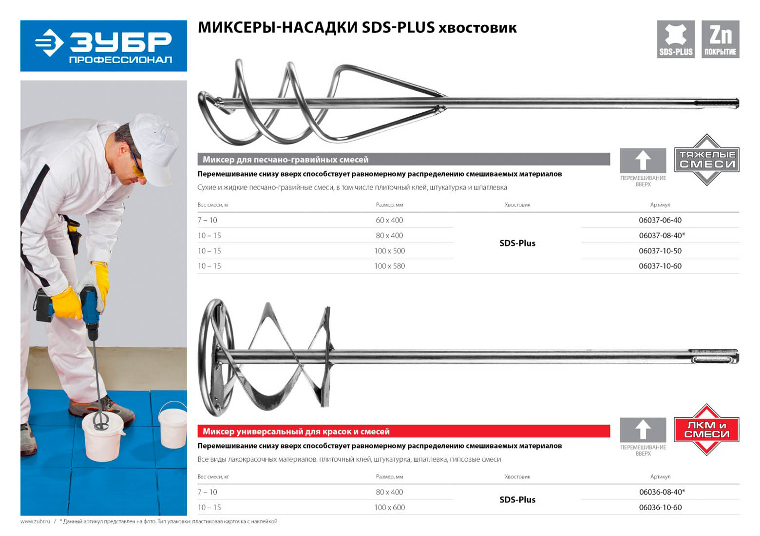 Миксер ЗУБР "ПРОФЕССИОНАЛ" для песчано-гравийных смесей, SDS+ хвостовик, оцинкованный, на подвеске, 80x400мм