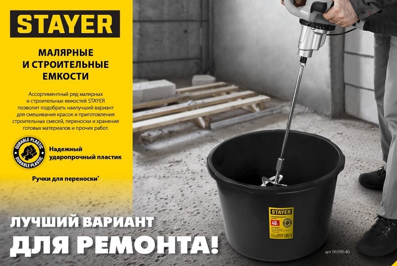 Подходит для приготовления любых видов строительных растворов (клеевых, штукатурных, лакокрасочных)