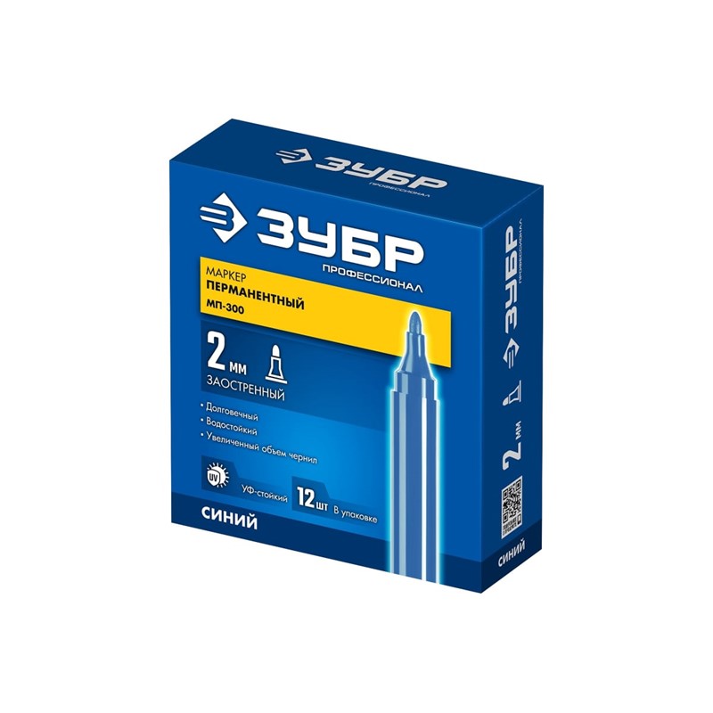 Перманентный маркер 2 мм, заостренный, синий ЗУБР Профессионал МП-300 06322-7 предназначен для нанесения маркировки, надписей, графических и текстовых обозначений, где требуется разборчивая маркировка при проведении ремонтных, строительных и отделочных работ.