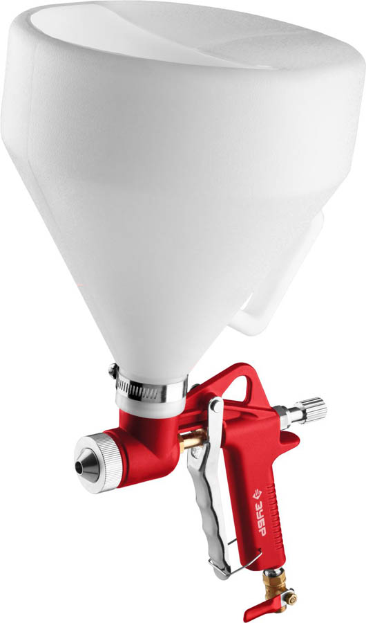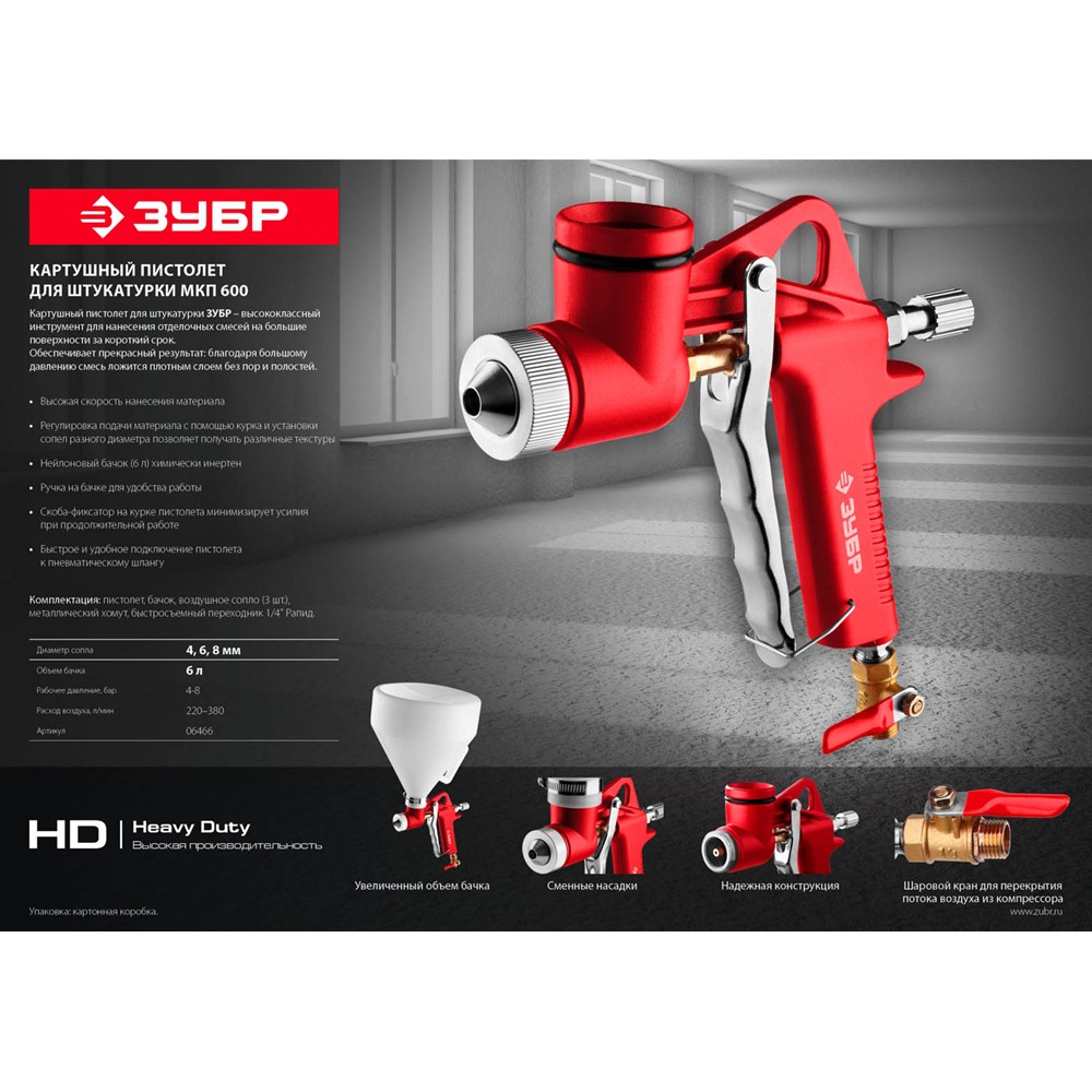 Картушный пистолет для штукатурки МКП 600 ЗУБР 06466, предназначен для обработки больших поверхностей за очень короткое время. При этом получается очень плотный слой без пор и полостей, так как смесь наносится под большим давлением. - Высокая скорость нанесения материала на обрабатываемые поверхности. Регулировка подачи материала и возможность установки сопл разного диаметра позволяет получать различные текстуры. Ручка на бачке позволяет работать двумя руками. Скоба-фиксатор на курке пистолета минимизирует усилия при продолжительной работе. Использование пластикового адаптера позволяет наносить покрытия на пол и потолок. Быстрое и удобное подключение пистолета к пневматическому шлангу.