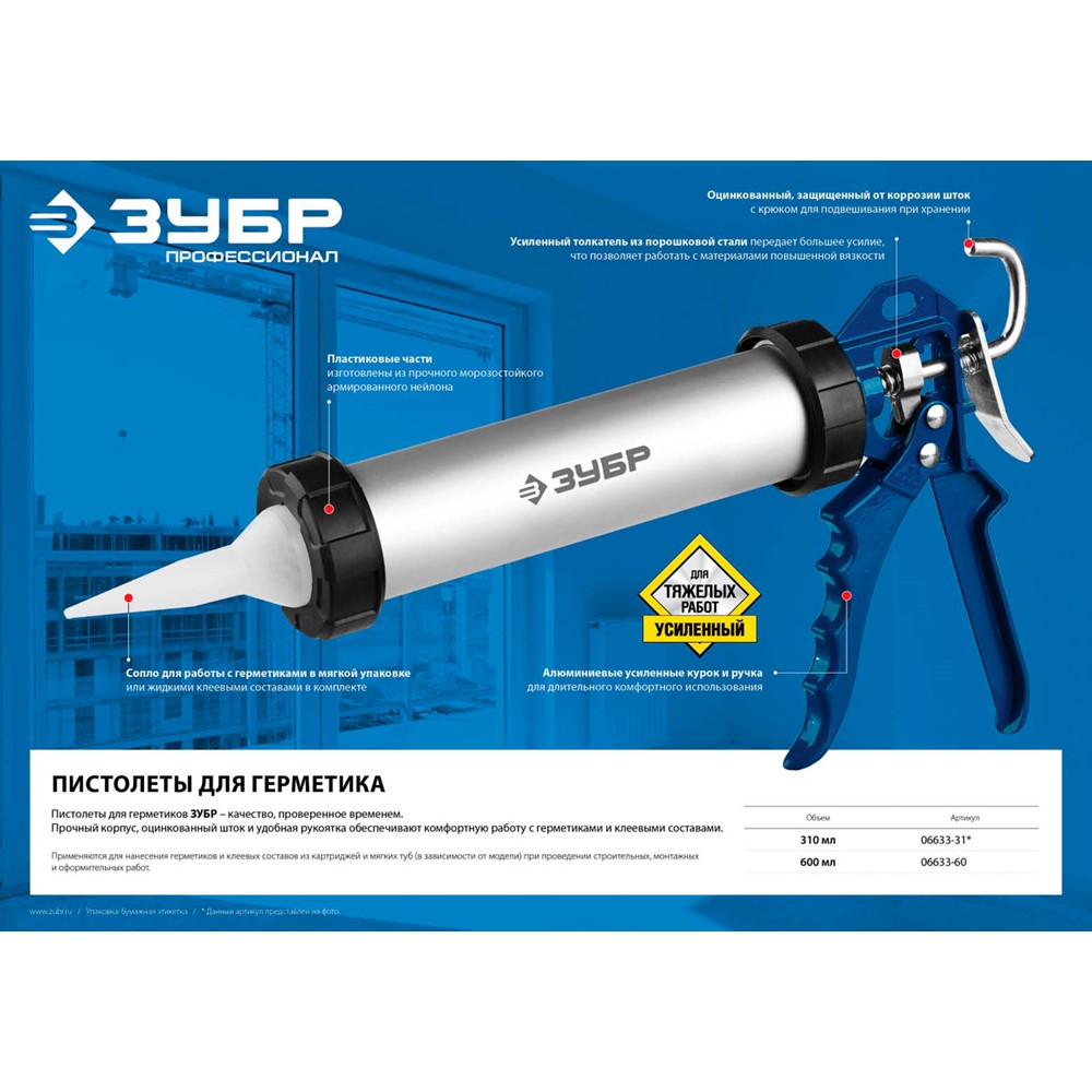 Пистолет для герметика ЗУБР 06633-31, предназначен для нанесения герметиков и клеевых составов. Пистолет для герметиков ЗУБР подходит для работы с герметиками без упаковки (в промышленной упаковке), в тубах и картриджах объемом до 310 мл. Позволяет осуществить прямой забор материала в корпус пистолета, эргономичная форма рукоятки создает комфортные условия работы. Изготовлен из особопрочных материалов. Может использоваться для применения герметиков без упаковки (в промышленной упаковке), в тубах и картриджах объемом до 310 мл. Позволяет осуществить прямой забор материала в корпус пистолета. Эргономичная форма рукоятки. Изготовлен из особопрочных материалов.