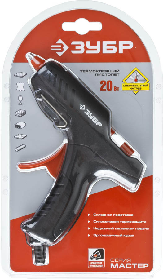 Клеевой пистолет ЗУБР 06850-20-08_z02, предназначен для надежного склеивания различных материалов: древесина, металл, керамика, стекло, пласт- масса, кожа, ткань – при помощи разогретого клея. Контроль количества наносимого клеевого состава осуществляется благодаря устройству механической подачи. Металлический наконечник защищен силиконовой накладкой. Эргономичный курок. Компактный корпус из ударопрочного термостойкого пластика.