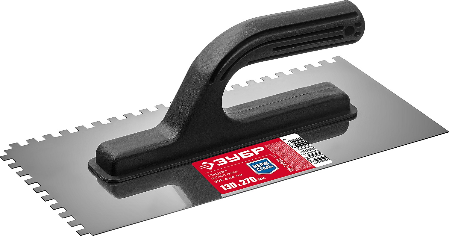 ЗУБР Мастер 130х270 мм, 6х6 мм, гладилка штукатурная зубчатая нержавеющая с пластиковой ручкой