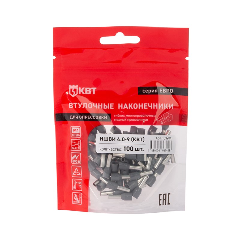 Назначение, применение: Оконцевание методом опрессовки гибких многопроволочных медных проводников сечением 4 мм². Трансформирует концы многожильных проводов в монолитные штифты. Монтаж одного провода