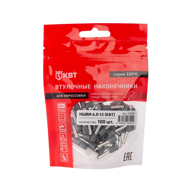 Назначение, применение: Оконцевание методом опрессовки гибких многопроволочных медных проводников сечением 4 мм². Трансформирует концы многожильных проводов в монолитные штифты. Монтаж одного провода