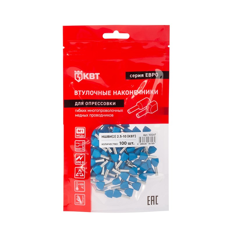 Назначение, применение: Оконцевание методом опрессовки гибких многопроволочных медных проводников сечением 2x2.5мм². Трансформирует концы многожильных проводов в монолитные штифты. Монтаж сдвоенных проводов одинакового сечения