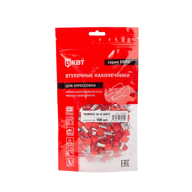 Назначение, применение: Оконцевание методом опрессовки гибких многопроволочных медных проводников сечением 2x10 мм². Трансформирует концы многожильных проводов в монолитные штифты. Монтаж сдвоенных проводов одинакового сечения