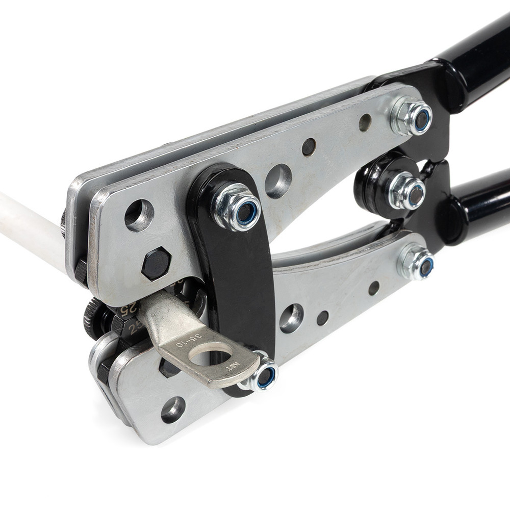 | Краткая характеристика | • Диапазон сечений: 6–50 мм²; • Тип прессуемых наконечников: ТМЛс, ТМЛс (45), ТМЛс (90), ТМЛ-Р, ТМЛ-У, НШМЛ, ГМЛс, ГМЛ-П; • Встроенные матрицы револьверного типа; • Ширина опрессовочного профиля: 5 мм; • Гексагональный обжим; • Быстрая перенастройка на нужный размер; • Подпружиненные штифтовые фиксаторы для быстрой установки необходимой позиции согласно сечения наконечника; • Корпус из 5-миллиметровой стали; • Обработка поверхности: хромирование |