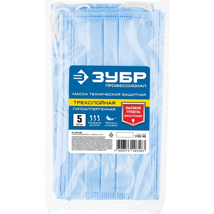Маска техническая защитная, трехслойная 11107-H5 Зубр