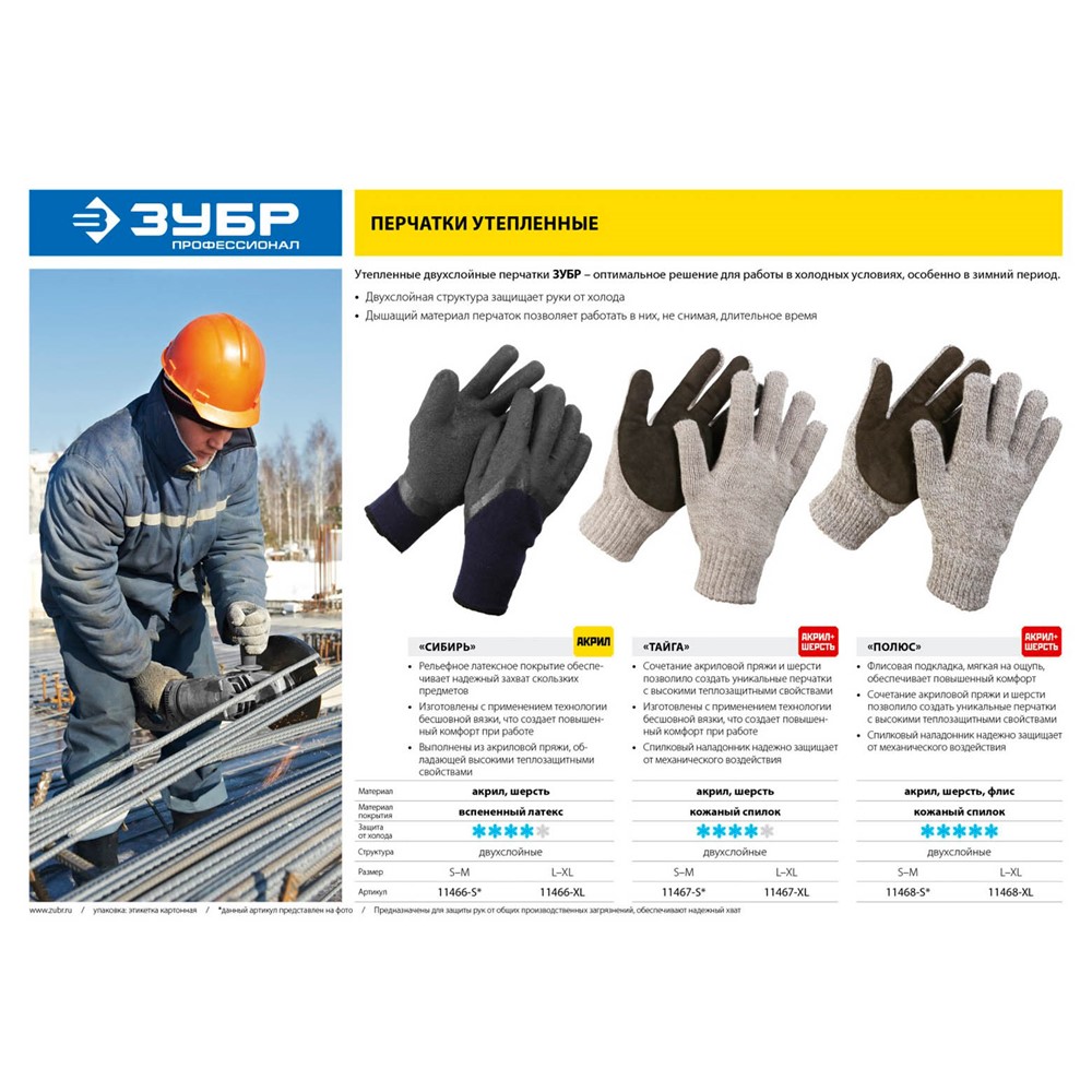 Перчатки утепленные ЗУБР 11467-S, предназначены для защиты рук от общих производственных загрязнений. Двухслойная структура перчаток предотвращает проникновение холода к руке. Спилковый наладонник надежно защищает ладонь от механического воздействия. Изготовлены с применением технология бесшовной вязки, что создает повышенный комфорт при работе. Дышащий материал перчаток позволяет работать в них, не снимая, длительное время.