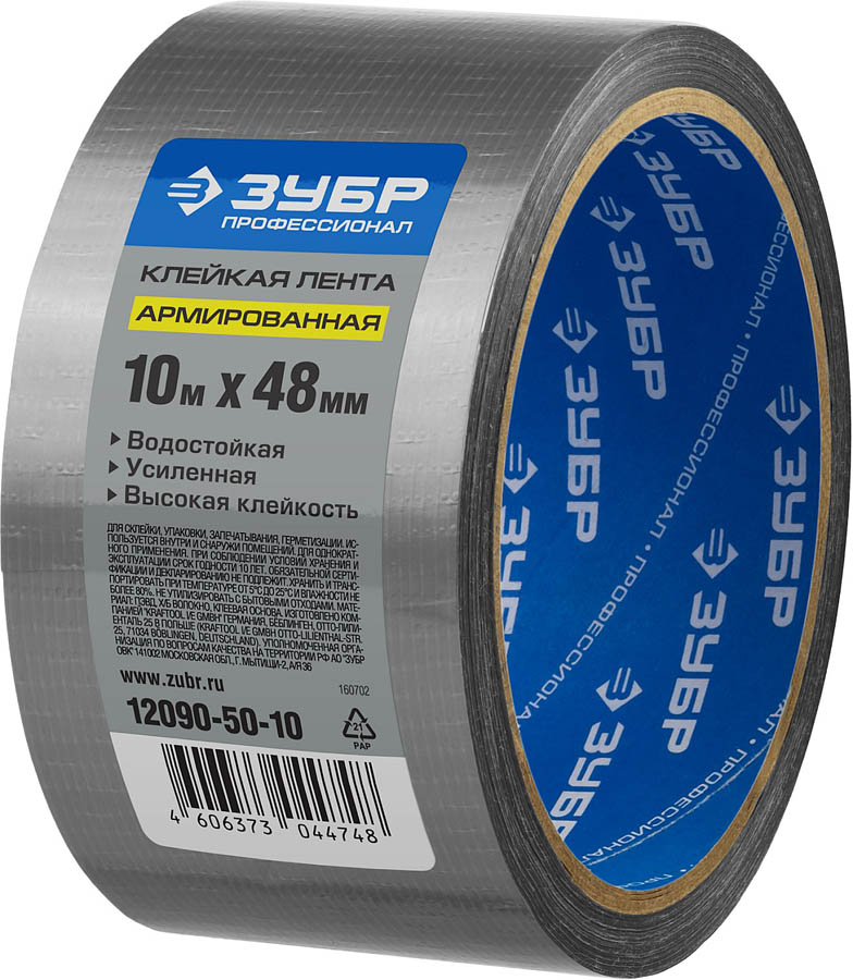 Армированная лента, ЗУБР Профессионал 12090-50-10, универсальная, влагостойкая, 48мм х 10м, серебристая