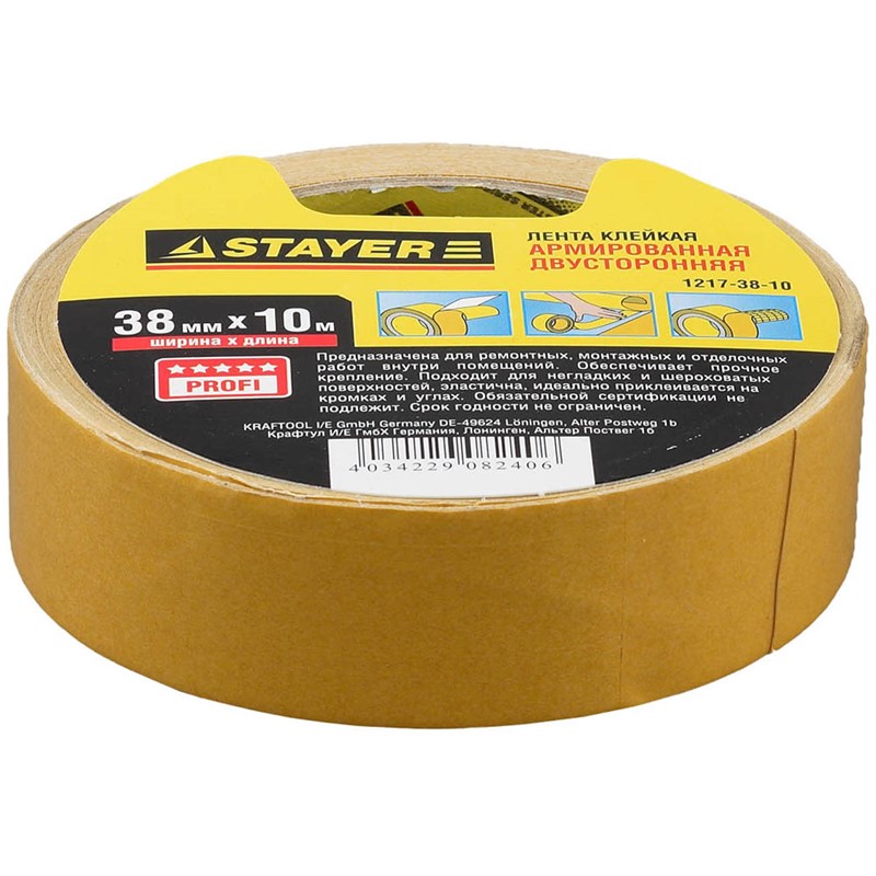 Двухсторонняя клейкая лента на тканевой основе, STAYER Profi 1217-38-10, 38мм х 10м