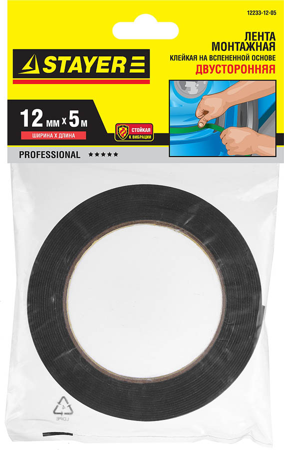 Двухсторонняя клейкая лента на вспененной основе, STAYER Professional 12233-12-05, черная, 12мм х 5м