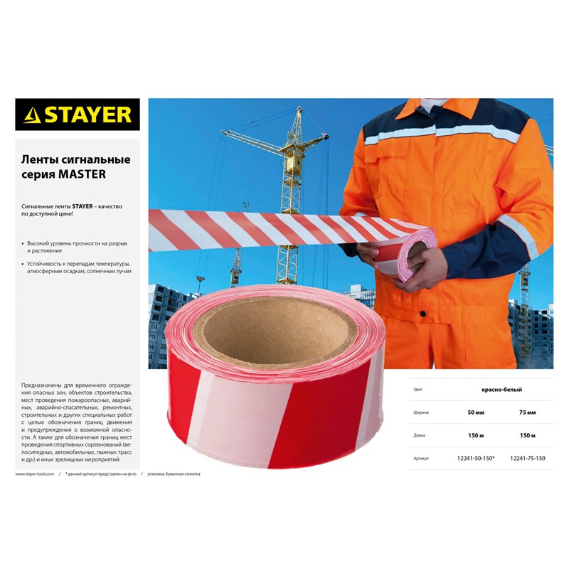 Лента сигнальная STAYER 12241-50-150, предназначена для временного ограждения опасных зон, объектов строительства, мест проведения пожароопасных, аварийных, аварийно-спасательных, ремонтных, строительных и других специальных работ с целью обозначения границ движения и предупреждения о возможной опасности. Также применяется для обозначения границ мест проведения спортивных соревнований (велосипедных, автомобильных, лыжных трасс и т.д.) и иных зрелищных мероприятий. Сигнальная лента изготовлена из полиэтилена высокого давления с нанесенным цветографичеким изображением. Обладает стойкостью к воздействию воды, высокой прочностью на растяжение и на разрыв.