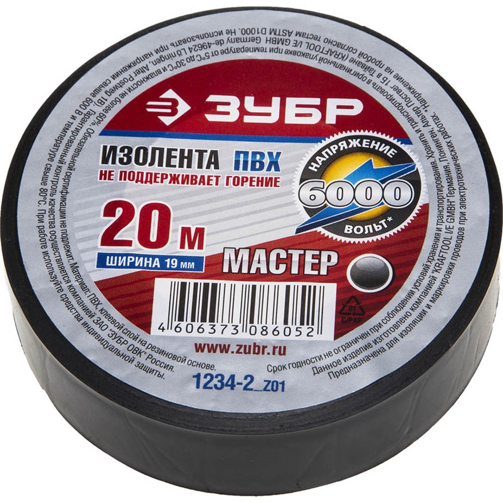 ЗУБР 19 мм х 20 м, напряжение до 6000 В/Гц, изолента ПВХ электрик-20 1234-2_z01