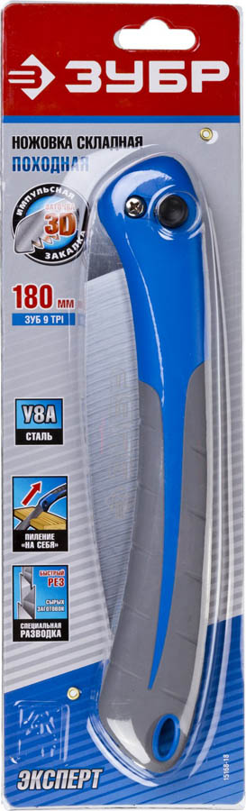Ножовка складная (пила) ПОХОДНАЯ 9 ЗУБР 15168-18, предназначена для поперечной распиловки древесины различных пород. Походная - профессиональный инструмент, изготовленный из высококачественной стали. Превосходно справляется как с обрезкой веток в саду, так и заготовкой дров в походе, а также с черновыми работами при строительстве. Специальный зуб японского типа обеспечивает быстрый рез крупных сырых заготовок. Пиление «на себя» обеспечивает приложение минимальных усилий при максимальной скорости реза. Изготовлена из высококачественной стали У8А. Двухкомпонентная пластиковая рукоятка обеспечивает надежный хват даже мокрой рукой или рукой в перчатке. Импульсная закалка каждого зуба в отдельности обеспечивает высокую твердость и механическую прочность зуба для длительного срока службы. Функция складывания позволяет облегчить транспортировку.