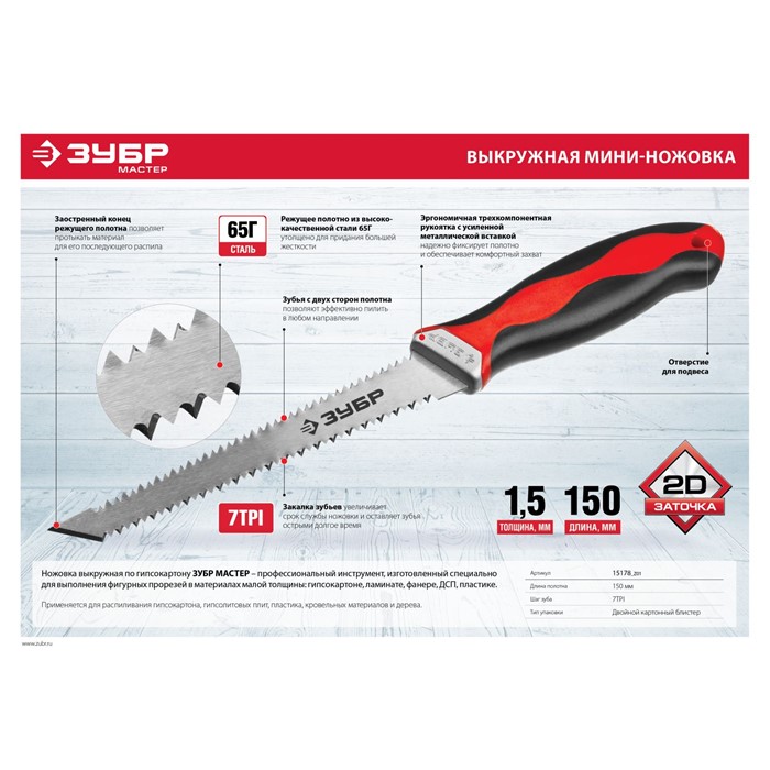 - Рукоятка с металлическим усилителем. Специальные закаленные зубья с двугранной заточкой обеспечивают быстрый, легкий и точный рез заготовок из древесины мягких и твердых пород. Двухсторонняя заточка лезвия для выполнения работ в направлении ″на себя″ и ″от себя″. Закалка зубьев увеличивает срок службы ножовки и оставляет зубья острыми долгое время. Острозаточенный конец режущего полотна позволяет протыкать материал для его последующего распила.