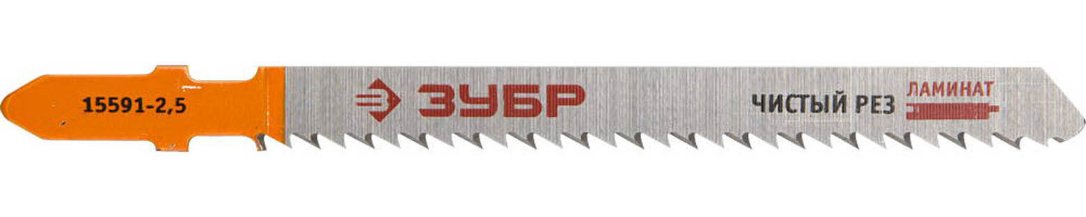 Полотна ЗУБР 15591-2.5_z01, применяются на электрическом лобзике при резке ламината, ДСП с покрытием и многослойной фанеры. Особое строение и заточка зубьев для чистого обратного реза. Увеличенная толщина рабочей части полотна. Ступенчатая термическая закалка. Автоматизированная заточка и шлифовка зубьев. Наиболее распространённый Т-образный хвостовик.