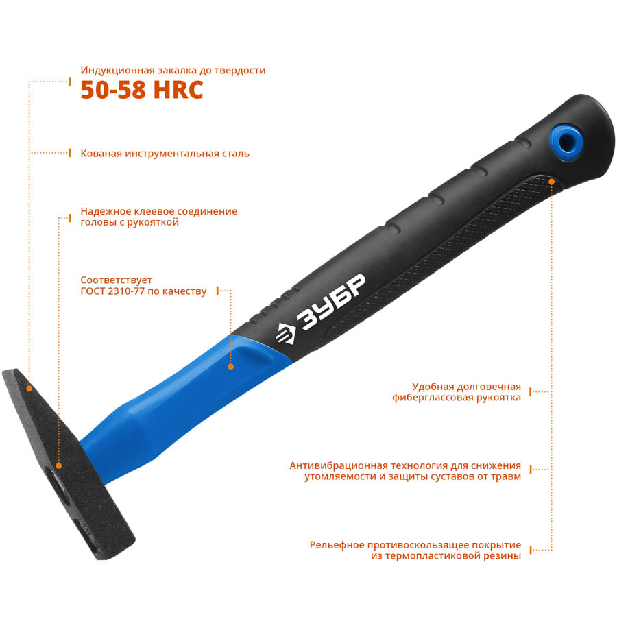 Молоток слесарный ЗУБР 20020-01_z01, предназначен для слесарно-монтажных работ. Двухкомпонентная фиберглассовая рукоятка. Рабочие поверхности головы закалены индукционным методом.