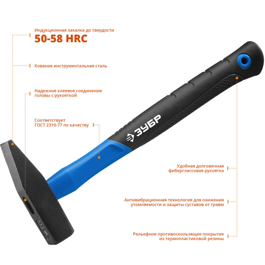 Молоток слесарный ЗУБР 20020-05_z01, предназначен для слесарно-монтажных работ. Двухкомпонентная фиберглассовая рукоятка. Рабочие поверхности головы закалены индукционным методом.