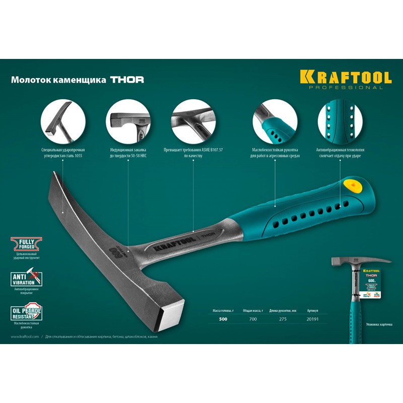Молоток каменщика Kraftool 20191, предназначен для строительных работ. Цельнокованая конструкция обеспечивает максимальную прочность и долгий ресурс. Мягкая накладка на рукоятке позволяет удобно и надёжно захватить инструмент, а также исключает проскальзывание. Воздушные камеры на рукоятке эффективно гасят вибрации.
