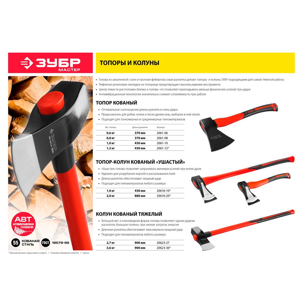 ЗУБР 2000 г., топор-колун кованый с двухкомпонентной фиберглассовой рукояткой 800 мм 20616-20