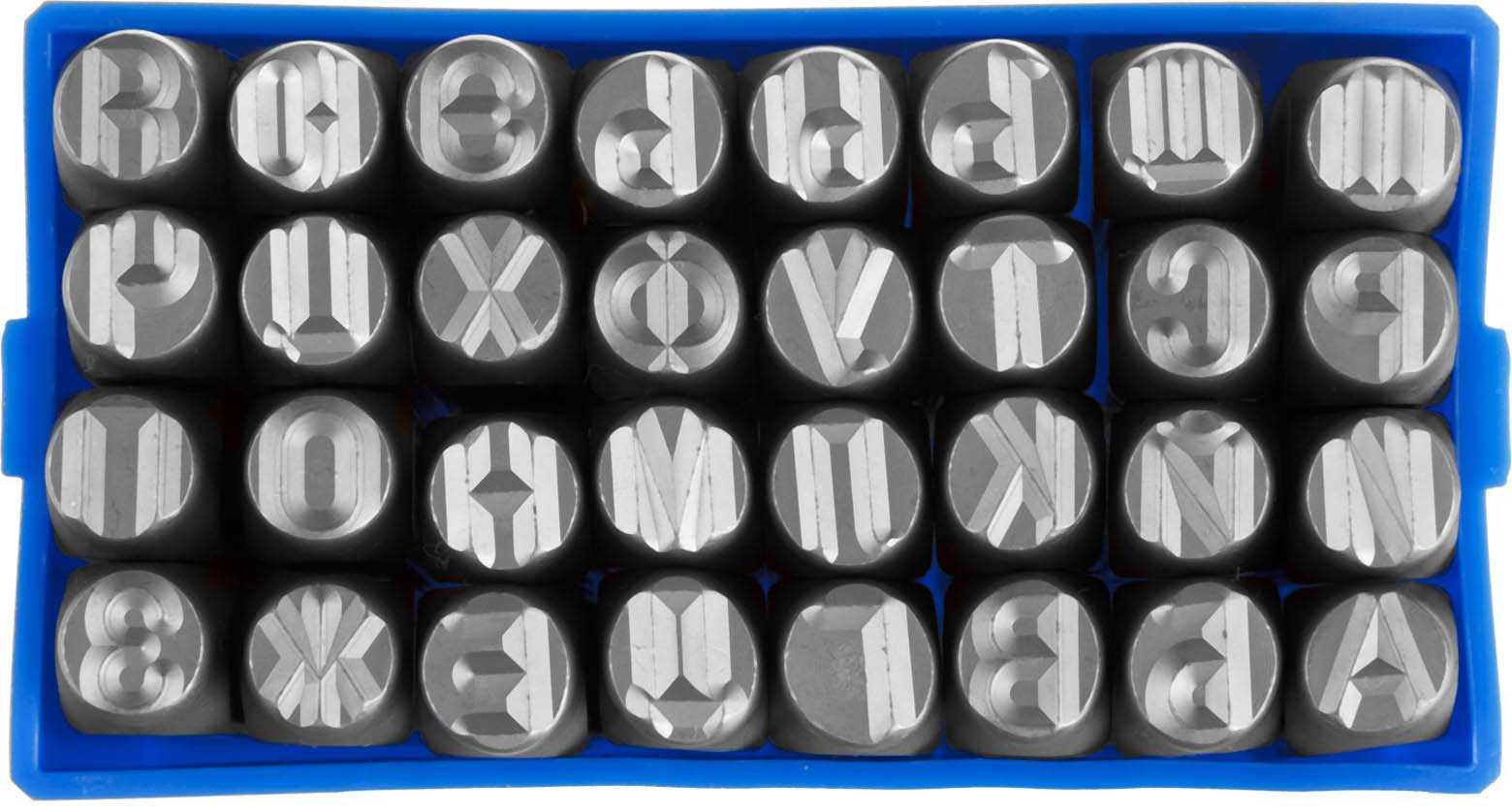 Клейма ЗУБР 21503-08_z01, предназначены для нанесения штампов в виде буквенных символов на различные поверхности. Профессиональные клейма «ЗУБР» со специальным никелированным покрытием обладают повышенным ресурсом. Применяются в промышленности, коммунальном секторе, профессионалных и личных мастерских. Изготовлены из высококачественной легированной хромом инструментальной стали. Специальная закалка до твердости 60–65 HRC.