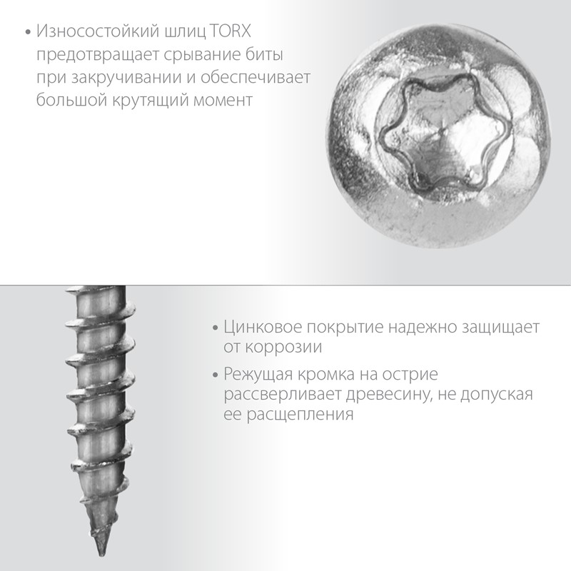 Конструкционные саморезы обладают высокой прочностью и пластичностью, благодаря чему не разрушаются при деформациях и изгибе. Режущая кромка на острие и точная геометрия резьбы значительно облегчают вкручивание самореза и предотвращают растрескивание древесины.