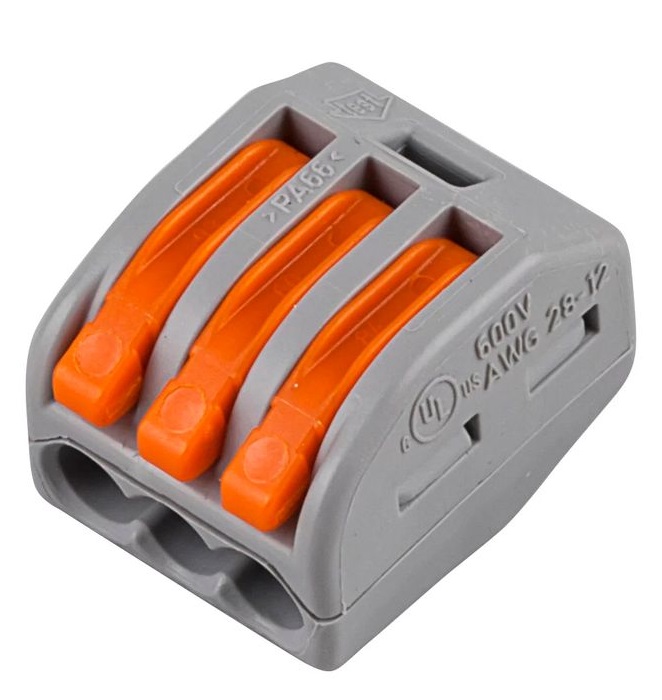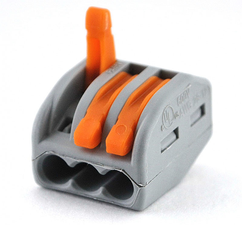 - Зажим проводов в клемме осуществляется при помощи оранжевых рычагов