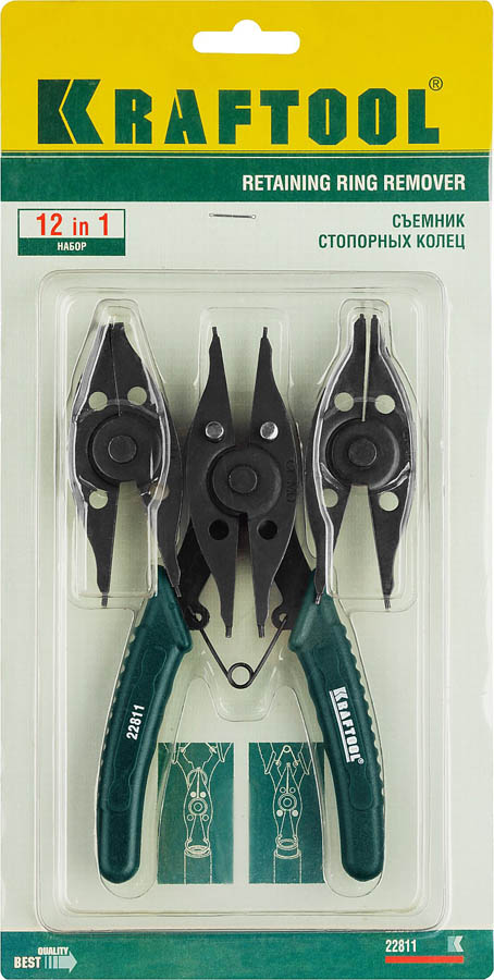 Съемник KRAFTOOL 22811, предназначен для монтажа и демонтажа внутренних и внешних стопорных колец. Пластиковые рукоятки съемника стопорных колец обеспечивают надежное удержание в руке без выскальзывания. Наконечники дополнительно закалены токами высокой частоты, поэтому обладают повышенной износостойкостью.
