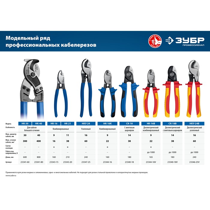 Кабелерезы ЗУБР изготовлены из высококачественной стали и предназначены для резки небронированного одножильного и многожильного кабеля из цветных металлов ( Cu + Al ) без деформации и замятия краев.
