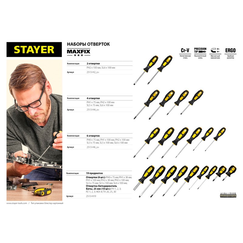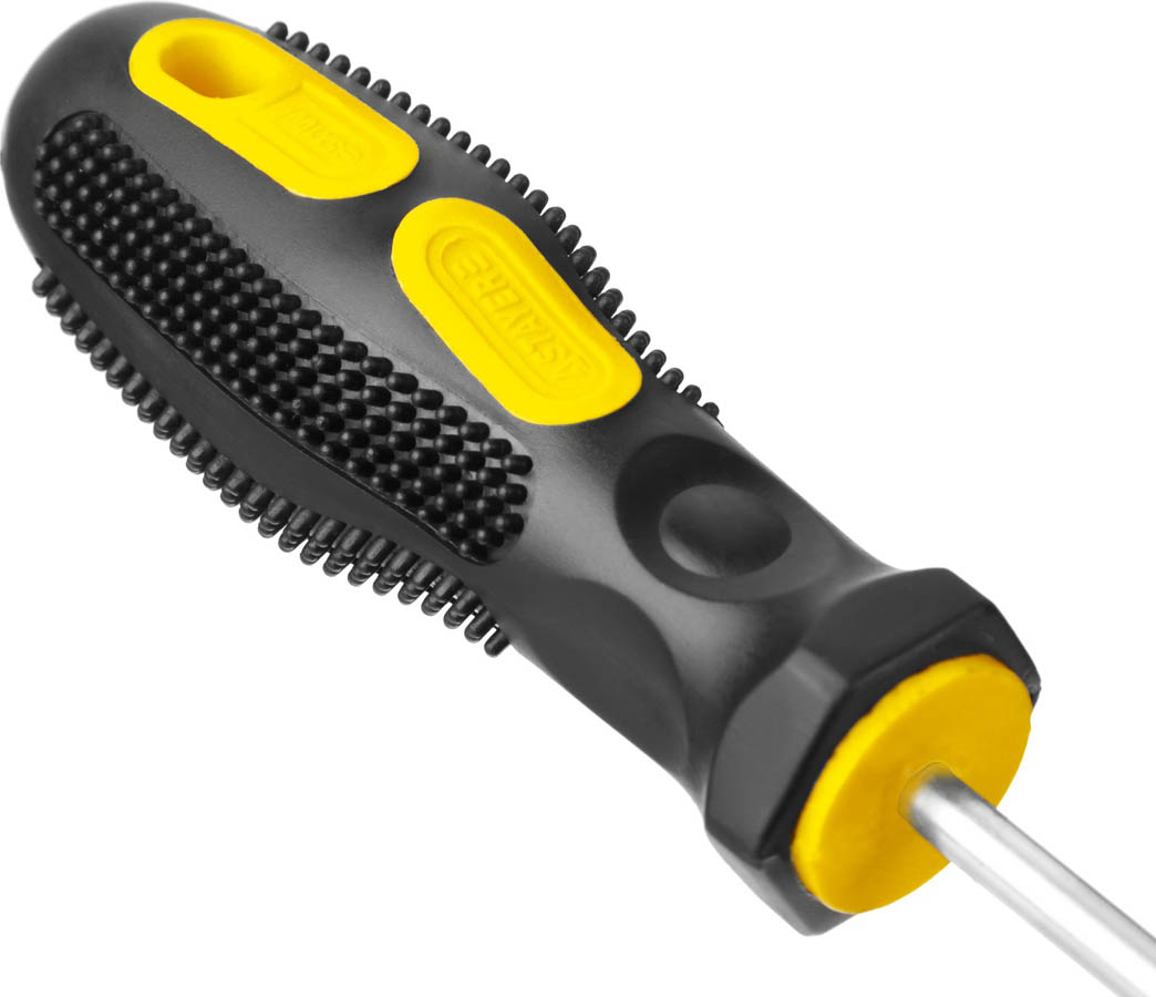Набор отверток STAYER 2513-H2_z01, предназначен для монтажа и демонтажа резьбовых соединений. Эргономичная двухкомпонентная рукоятка обеспечивает надежный и комфортный захват. Стержень и биты из высококачественной хромованадиевой стали. Оксидированный намагниченный наконечник обеспечивает удобство в работе.