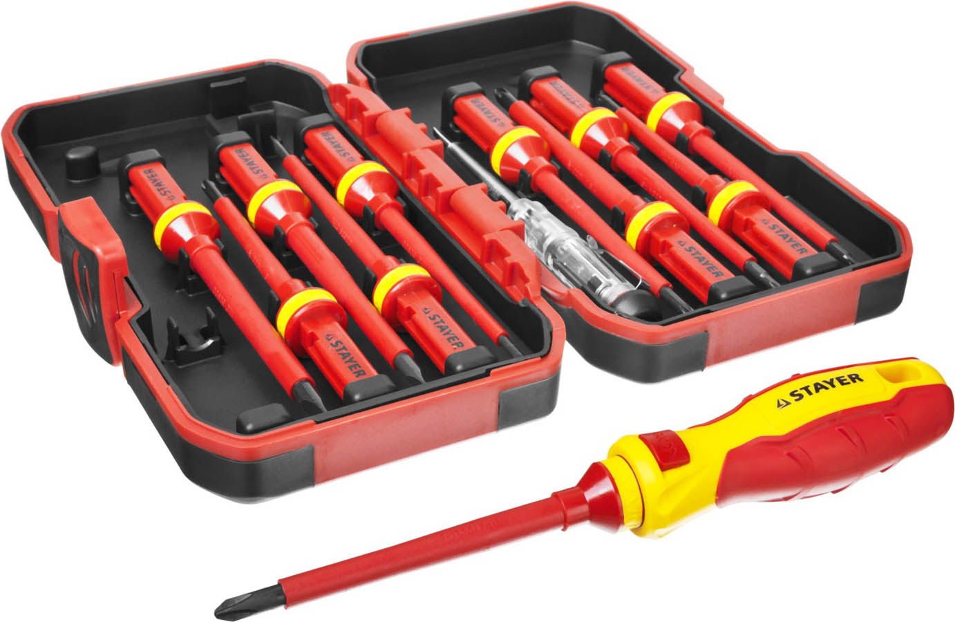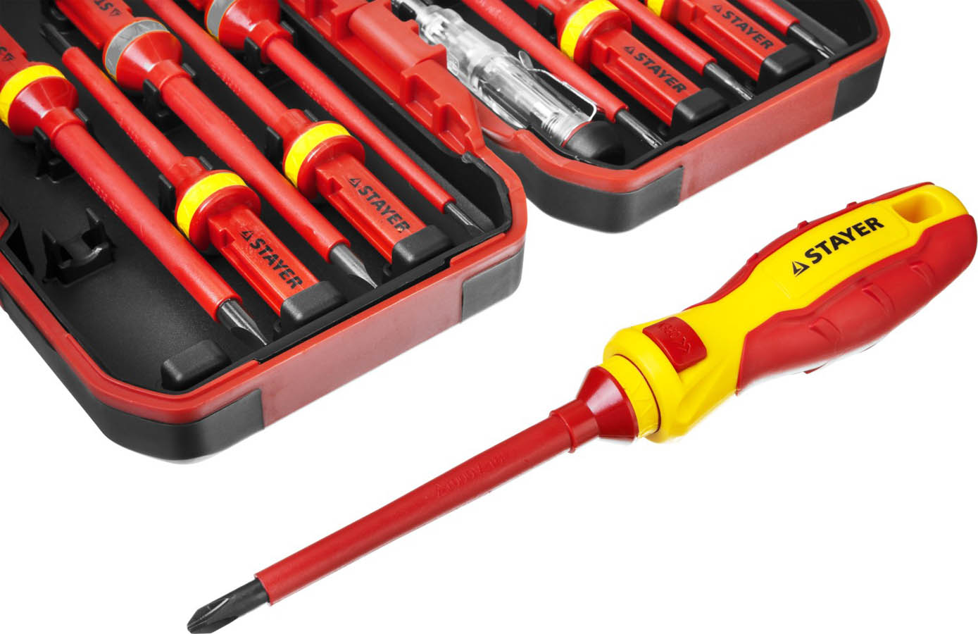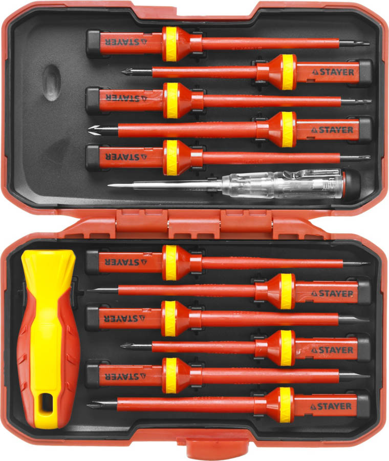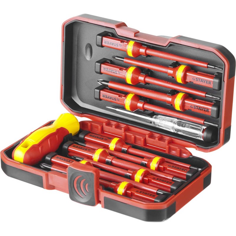 Набор отверток диэлектрический STAYER 25146-H13, предназначен для выполнения электромонтажных работ под напряжением до 1000 В. Изделия изготовлены из высококачественной хромованадиевой стали. Рабочие поверхности закалены. Противоскользящая рукоятка обеспечивает приложение высокого крутящего момента. Высокоточный наконечник обеспечивает надежную посадку в крепеже.