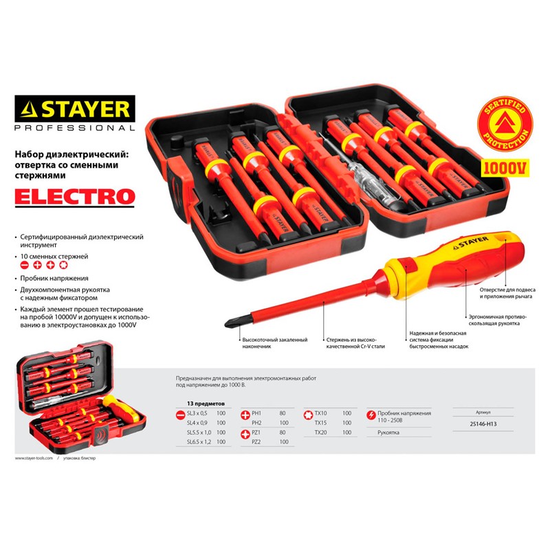 STAYER 13 шт., отвертка со сменными стержнями ELECTRO 25146-H13