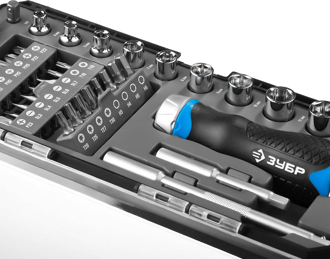 Набор инструментов ЗУБР 25352-H38, предназначен для монтажа и демонтажа резьбовых соединений. Биты и из хромомолибденовой стали. Торцовые головки из хромованадиевой стали. Специально сконструированная эргономичная двухкомпонентная рукоятка оптимальной формы обеспечивает надежный и комфортный захват. Отсек для хранения бит в рукоятке. Компактный пластиковый бокс для удобства хранения и переноски.