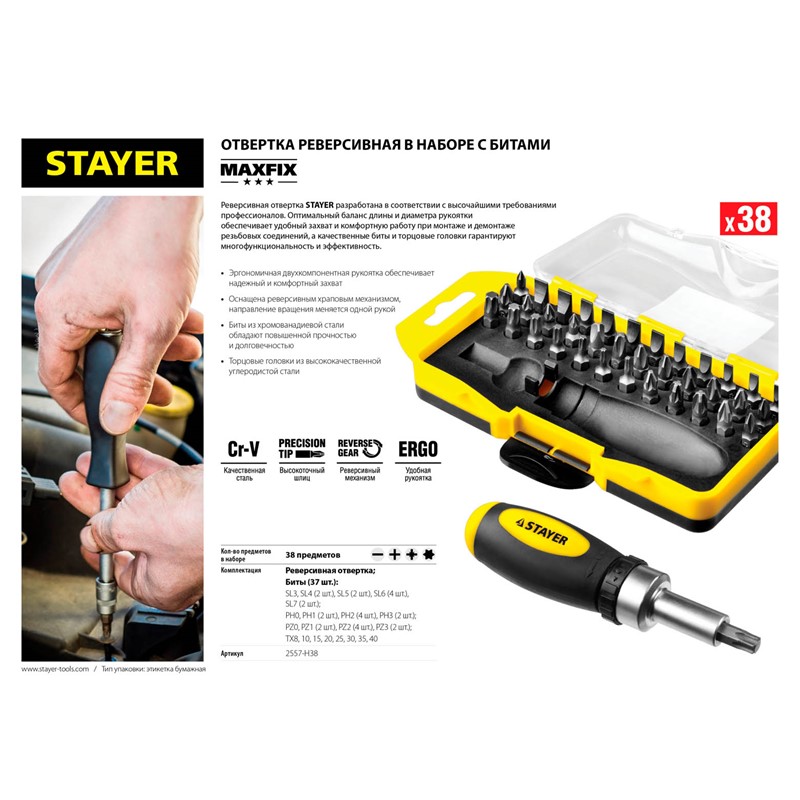 STAYER Compact-38 набор: реверсивная отверка с насадками 38 шт