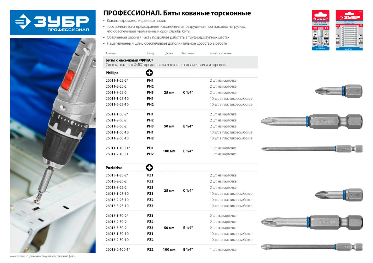 Биты ЗУБР "ЭКСПЕРТ" торсионные кованые, обточенные, хромомолибденовая сталь, тип хвостовика C 1/4", PZ3, 25мм, 2шт