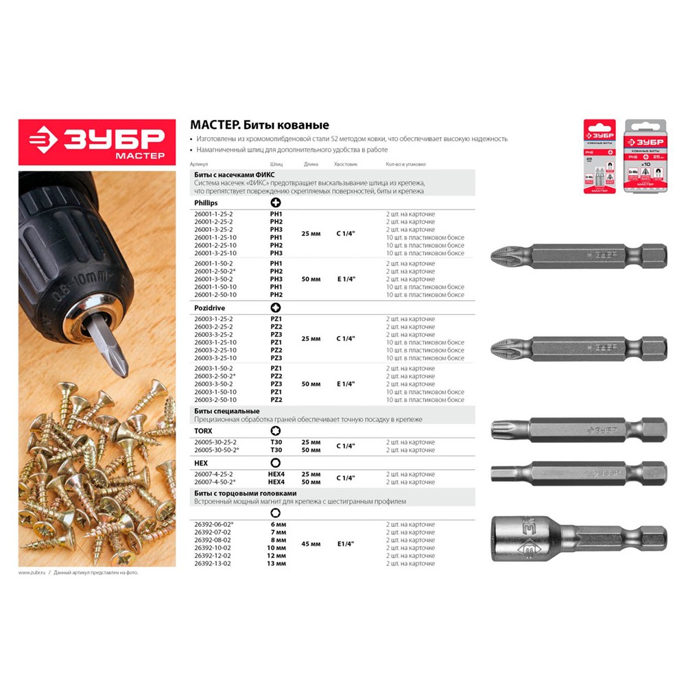 Биты ЗУБР "МАСТЕР" с торцовой головкой, магнитные, Cr-V, тип хвостовика E 1/4", 6х45мм, 2шт