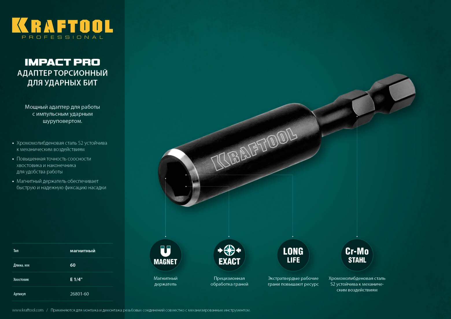 KRAFTOOL 60 мм, адаптер для бит для ударных шуруповертов 26801-60