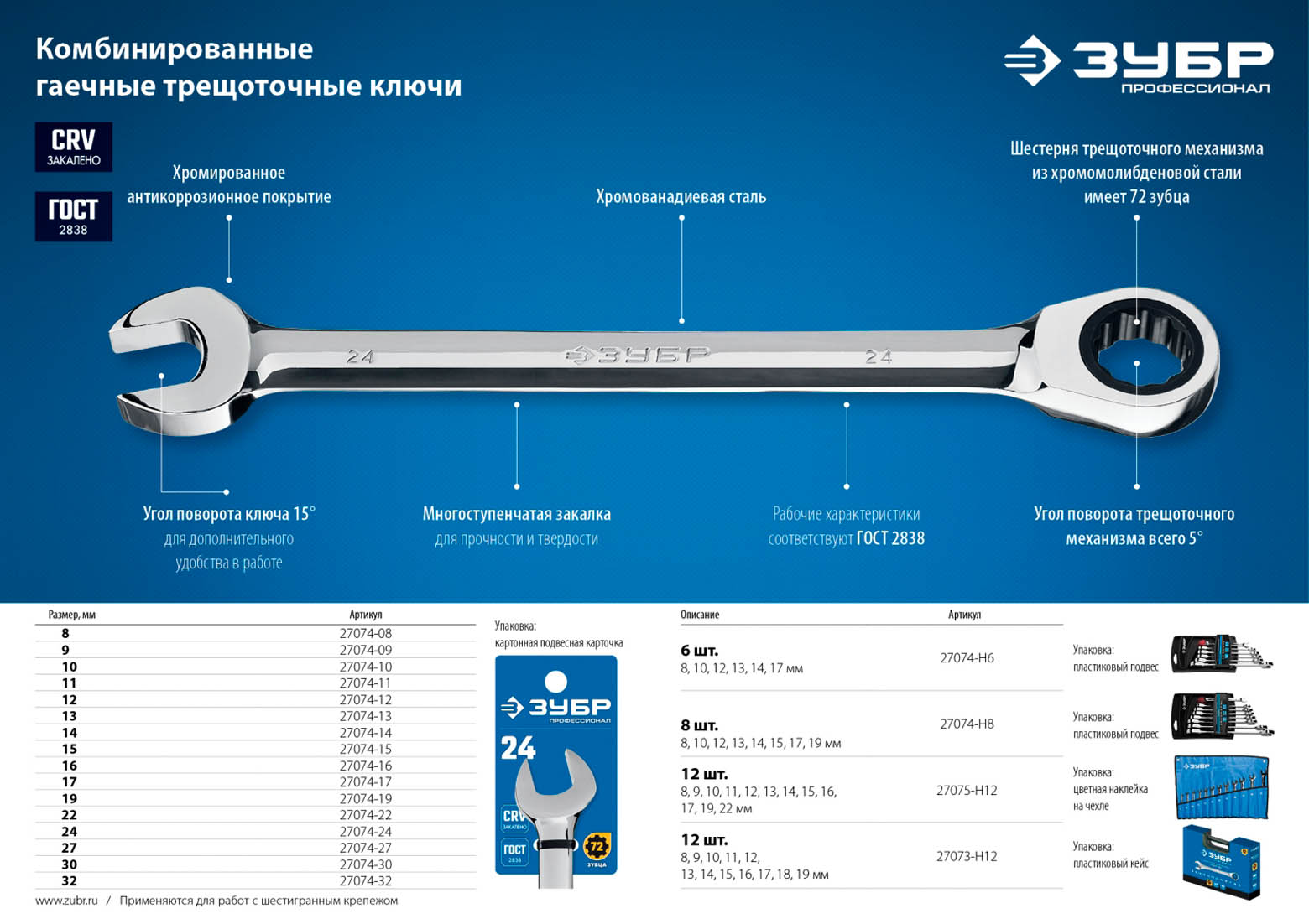 Комбинированный гаечный ключ ЗУБР 27074-12, применяется для работ с шестигранным крепежом. Благодаря правильному подбору материала и параметров технологического процесса выдерживает высокие нагрузки и стоек к истиранию рабочих граней. Трещоточный механизм. Изготовлен из высококачественной хромованадиевой стали с многоступенчатой закалкой для увеличения ресурса ключей, а также обладает надежным хромированным покрытием для защиты от коррозии.