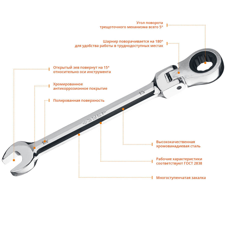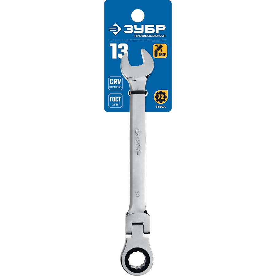 Комбинированный гаечный ключ трещоточный шарнирный 13 мм, ЗУБР