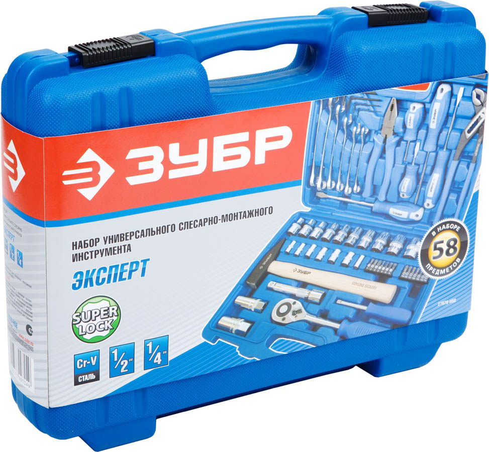 Набор инструментов ЗУБР 27670-H58, предназначен для проведения слесарных, монтажных и ремонтных работ. Изделия изготовлены из высококачественной хромованадиевой стали. Рабочие поверхности закалены. Хроматированное покрытие защищает от коррозии и увеличивает срок службы инструмента. Профиль «SUPER-LOCK» торцовых головок 1/2" для переноса пятен контактов с углов граней крепежа к их центру. Удобный пластиковый кейс для хранения и переноски инструмента.