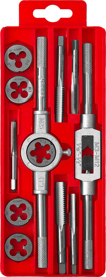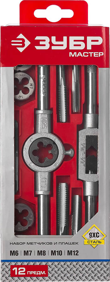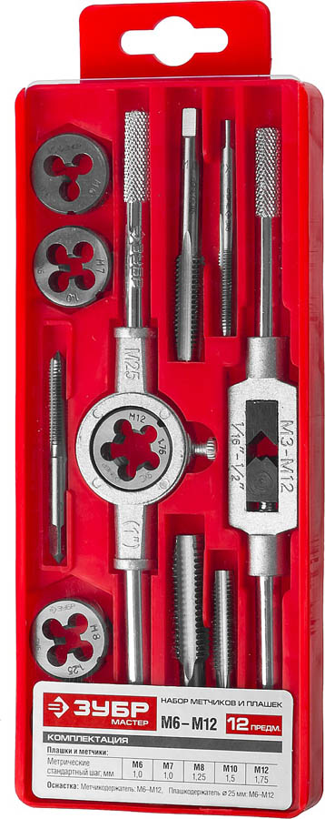 Набор ЗУБР "МАСТЕР" с металлореж. Инстр., метчики однопроходные и плашки М6-М12, оснастка - в пластиковом боксе, 12пред.