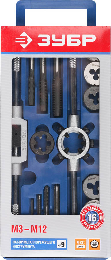 Набор ЗУБР "МАСТЕР" с металлореж. инстр., метчики однопроходные и плашки М3-М12, оснастка - в пластиковом боксе, 16пред.