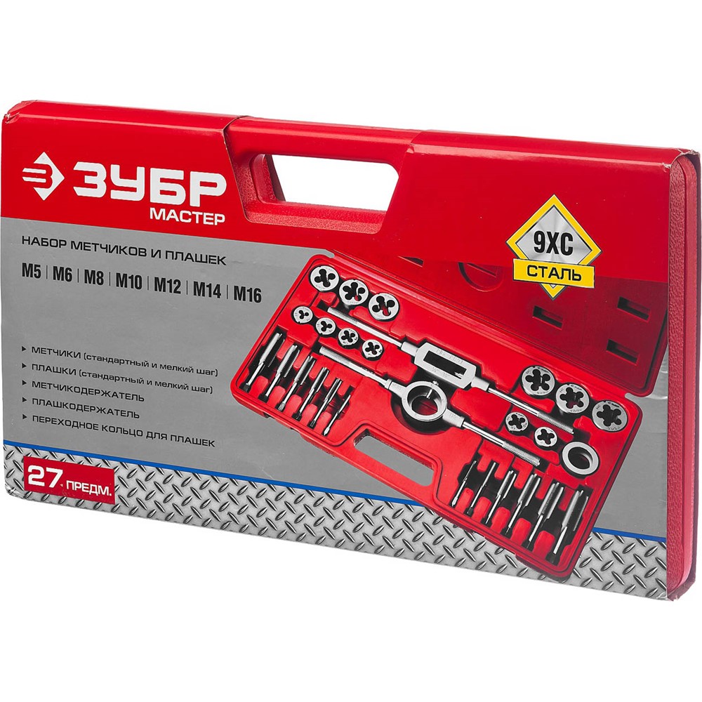 Набор ЗУБР "МАСТЕР" с металлорежущим инстр., метчики однопроходные и плашки М5-М16, оснастка - в пластик. боксе, 27пред.