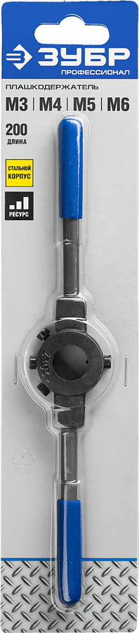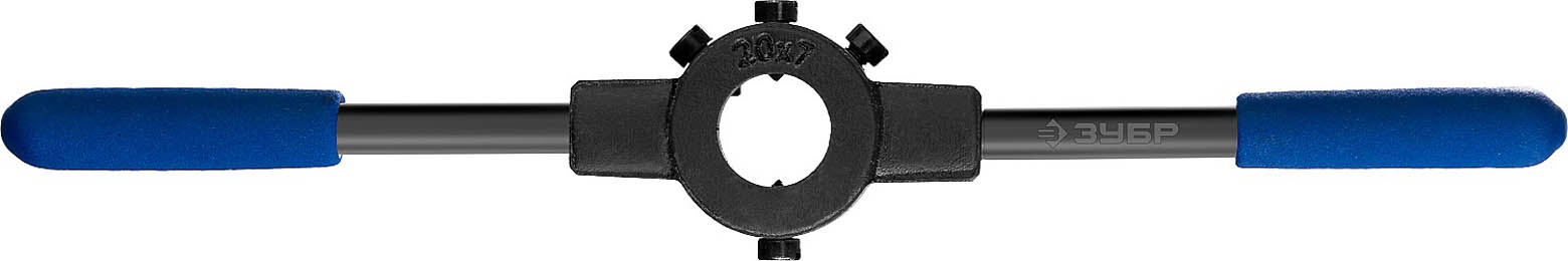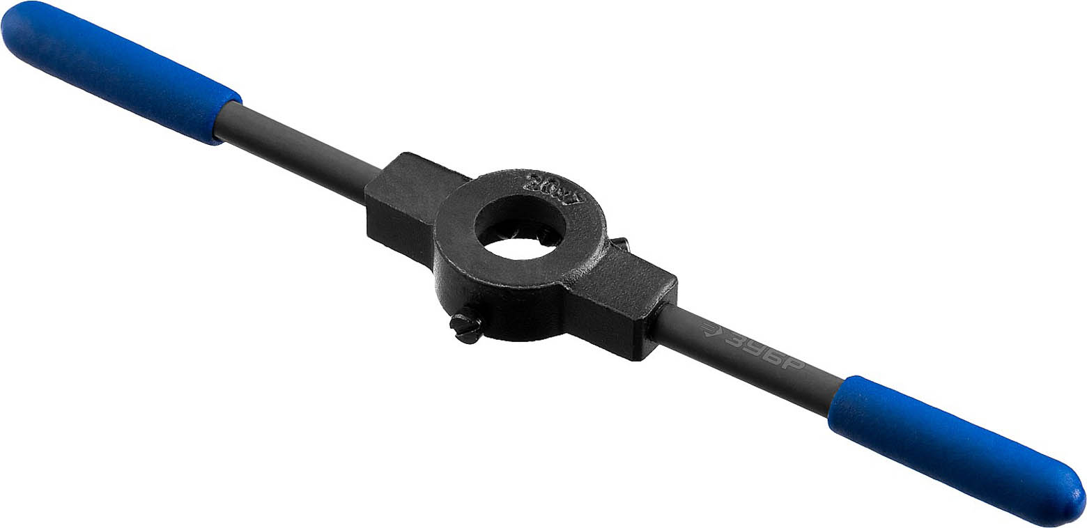 Плашкодержатель ЗУБР 28150-20, применяется при ручном нарезании внешней резьбы совместно с плашками. Специальные резиновые накладки на ручки предотвращают проскальзывание и обеспечивают надежность хвата. Плашкодержатель оснащен стопорными центровочными винтами для надежной фиксации плашки, парооксидирование защищает поверхность от коррозии.